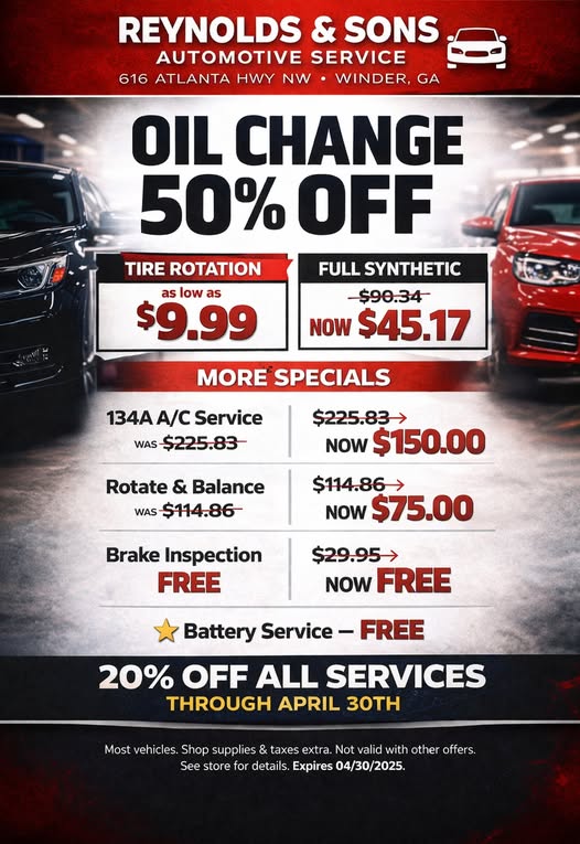 Reynolds & Sons Automotive Service Center, founded in 2026 and located in Winder, GA, proudly serves the greater surrounding area with top-quality auto care. We specialize in auto air conditioning service, ensuring your comfort on the road. Our skilled technicians also provide oil changes, tire rotations, brake jobs, alignments, shocks, and strut services. At Reynolds & Sons, customer satisfaction and reliable, honest repairs are our highest priorities. Trust us to keep your vehicle running smoothly all year round.